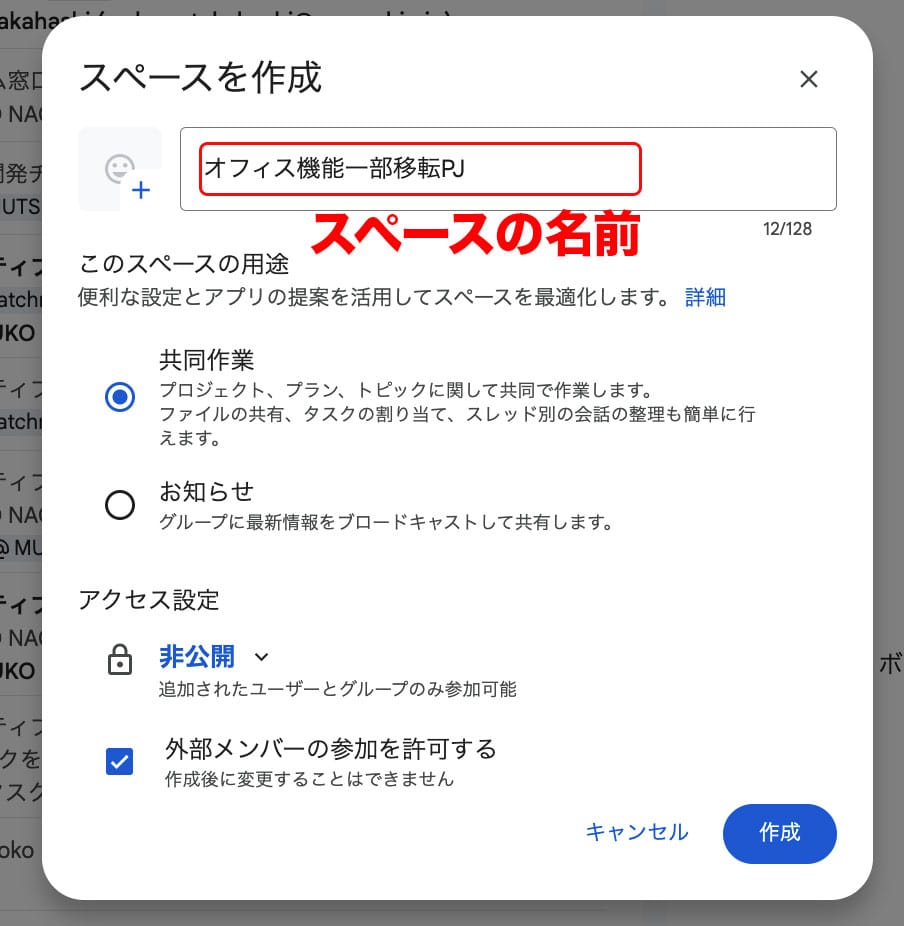 名前と説明 | メンバーの名前のリストが会話名になります。 | 作成者が自由にスペース名と説明文を設定できます。 (例:【〇〇プロジェクト】進捗共有スペース) |