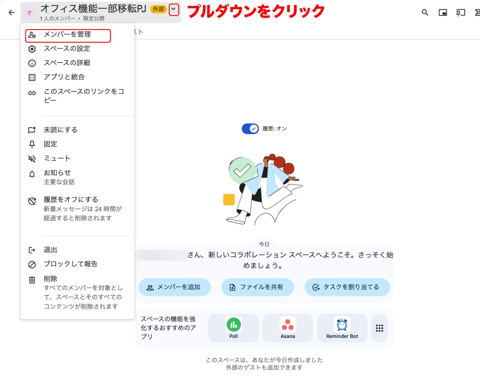 - スペースのメンバーを招待するには、スペース名の横にあるプルダウンを開いて 「メンバーを管理」 をクリックします。