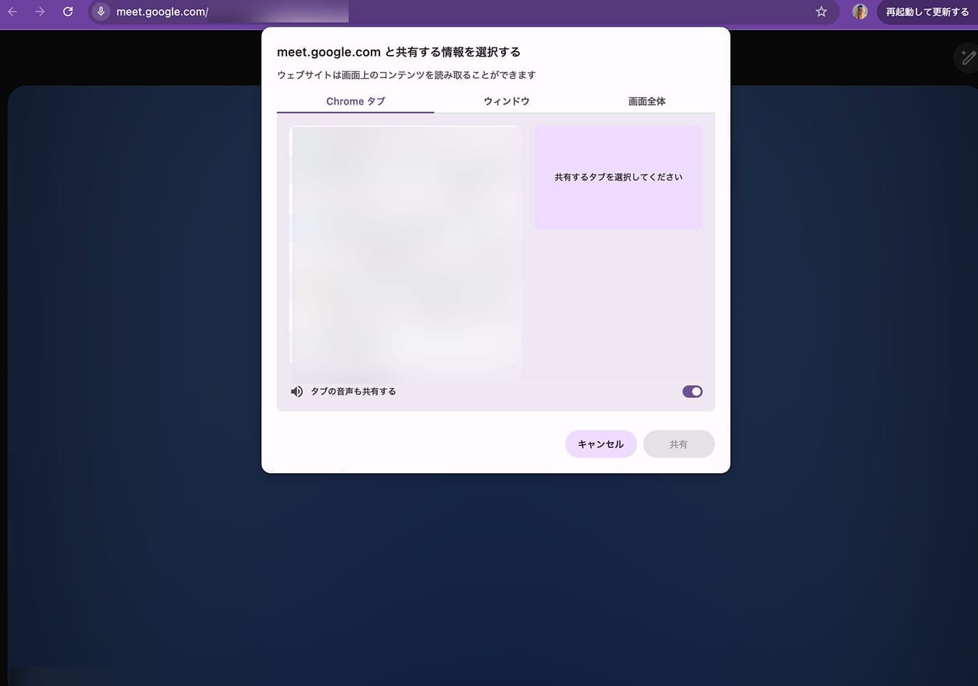 - [Chrome タブ] 、 [ウィンドウ] 、 [画面全体] から、プレゼンテーションで画面共有するものを選択し 「共有」 をクリックします。
