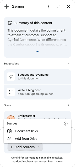 Gemini でサイドパネルを介して執筆支援を行う際、ドキュメント内にリンクされているソースのリストを自動的に収集し、ユーザーはそれらのソースの情報のみを基に詳細を抽出するように指示を選択できます。これにより、 Gemini からの提案が信頼できるコンテンツに焦点を当て、確かな根拠に基づくものになります。