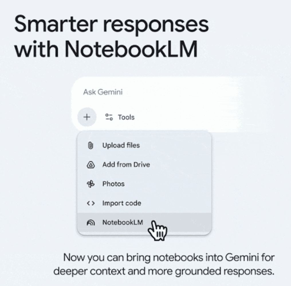 Google Workspace ユーザーは、NotebookLM のノートブックを Gemini アプリのソースとして追加できるようになりました。