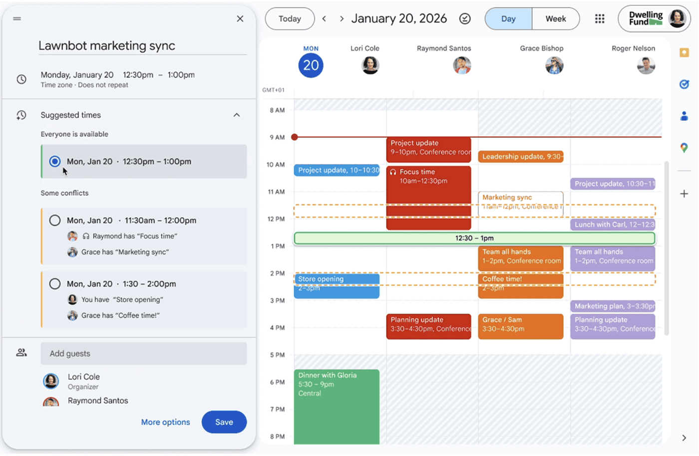 新規作成時や予定変更時に Gemini アプリ が同僚の空き時間、タイムゾーン、勤務時間、既存の予定との重複を分析し、最適な候補を提案します。 「候補の時間」 をクリックするだけで、全員にとって都合の良い時間を簡単に選択可能です。