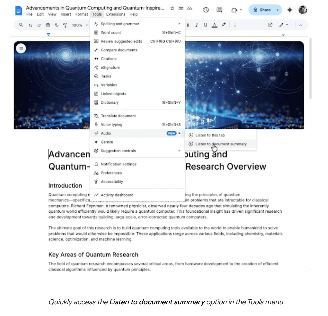 ◆ Listen to audio summaries in Google Docs