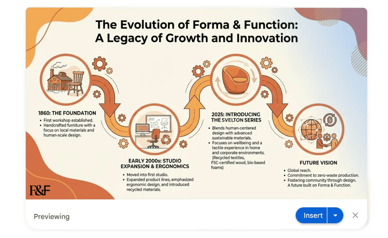 - NotebookLM : ソース資料からインサイトを可視化したり、スライドデッキを直接作成可能。