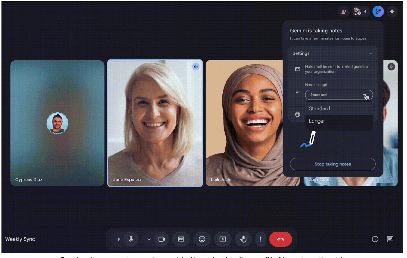 Google Meet の自動メモ生成機能では、Google Meet の会議中に 「メモの長さ ( Notes Length ) 」 設定から 「長め(Longer)」 を選択できるようになりました。これを選択すると、標準的な要約の約2倍の長さでメモが生成されます。