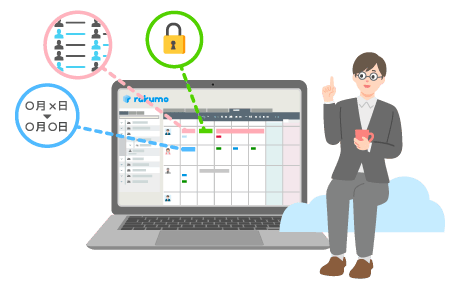 例えば、秘書が役員の予定を入力したい場合、予定を管理する秘書に 「予定の変更権限」 を付与すれば代理登録が可能になります。